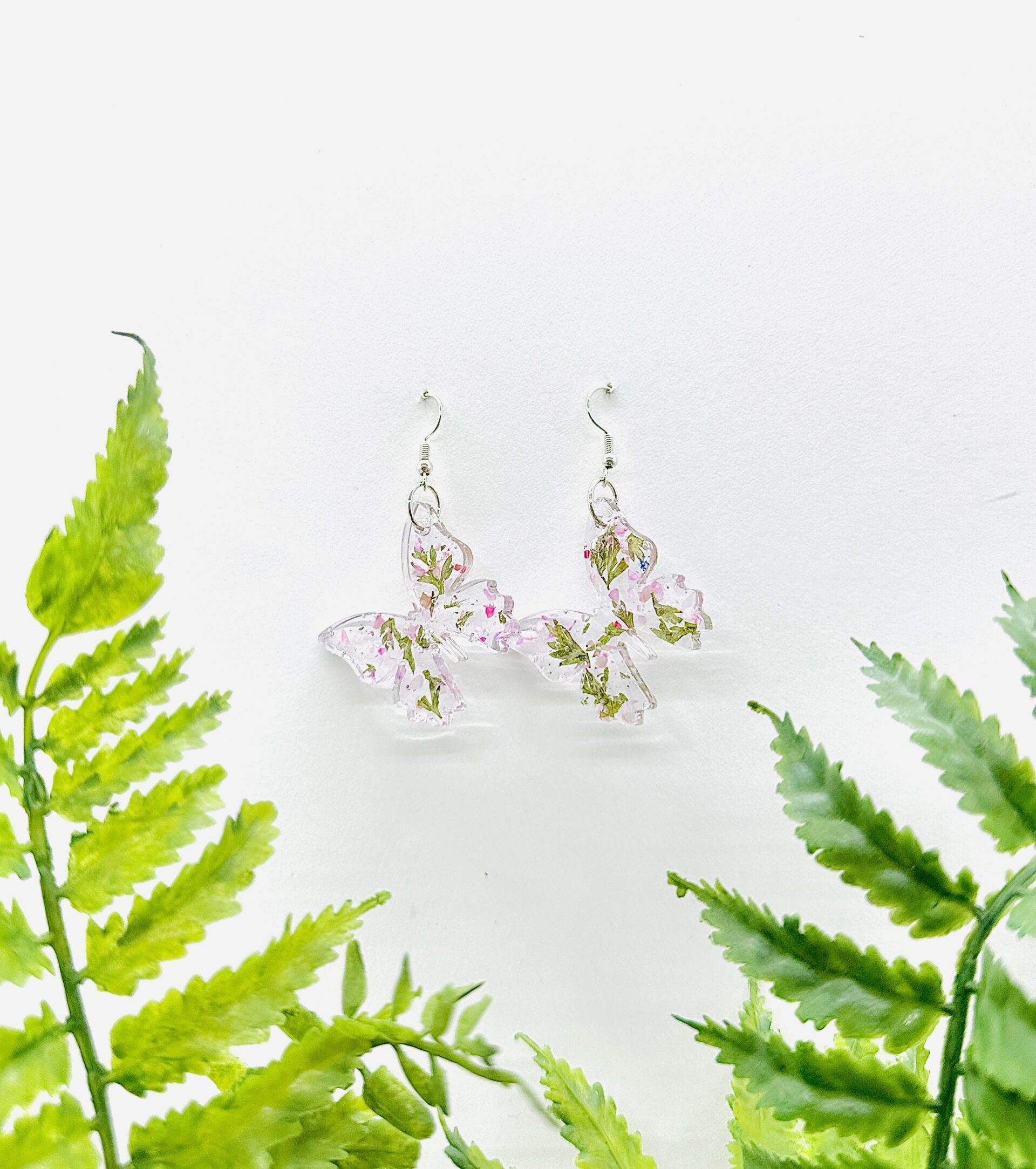 Handmade clear butterfly shaped earrings with crushed green leaves inside and pink glitter. Crafted with UV resin and finished with silver hooks, blending nature’s beauty with everyday wearability. Lightweight, durable, and one-of-a-kind — a little piece of nature you can wear.