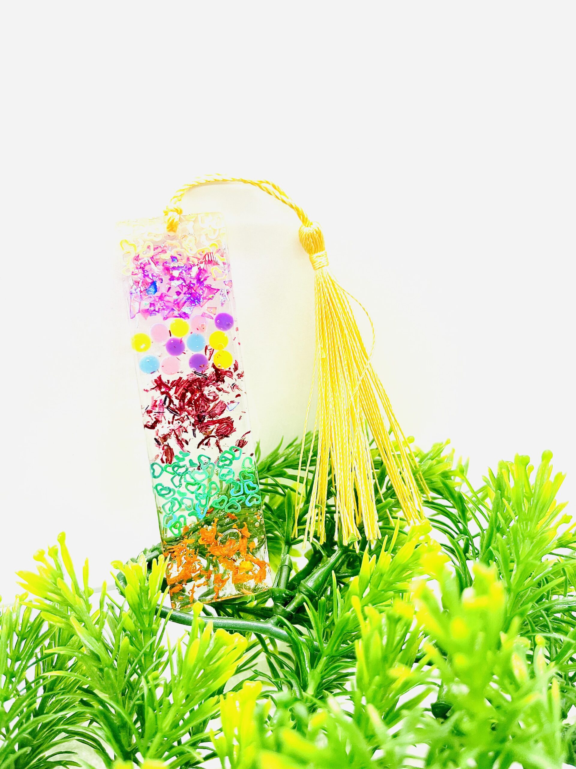 Handmade UV resin bookmark is with eye-catching mix of colorful sequins, glitter, and dried florals. Each layer brings its own pop of personality — from bold reds and greens to iridescent pinks and vibrant yellow accents. Finished with a golden tassel, this bookmark adds a cheerful touch of fun to every read.