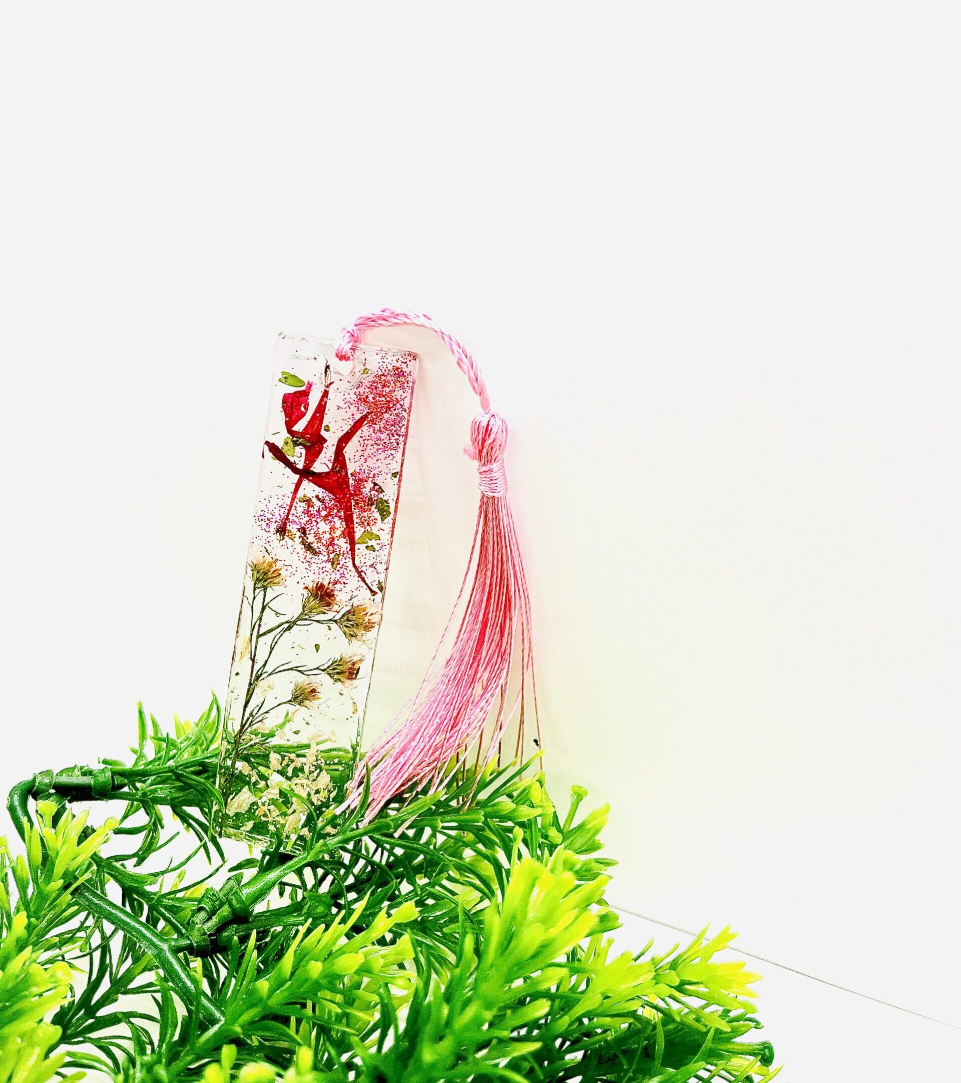 Handmade UV resin bookmark. This bookmark features real pressed fleabane flowers and pink bee balm petals, set in clear UV resin with a touch of pink glitter. Finished with a matching pink tassel for a simple, natural, and elegant look.