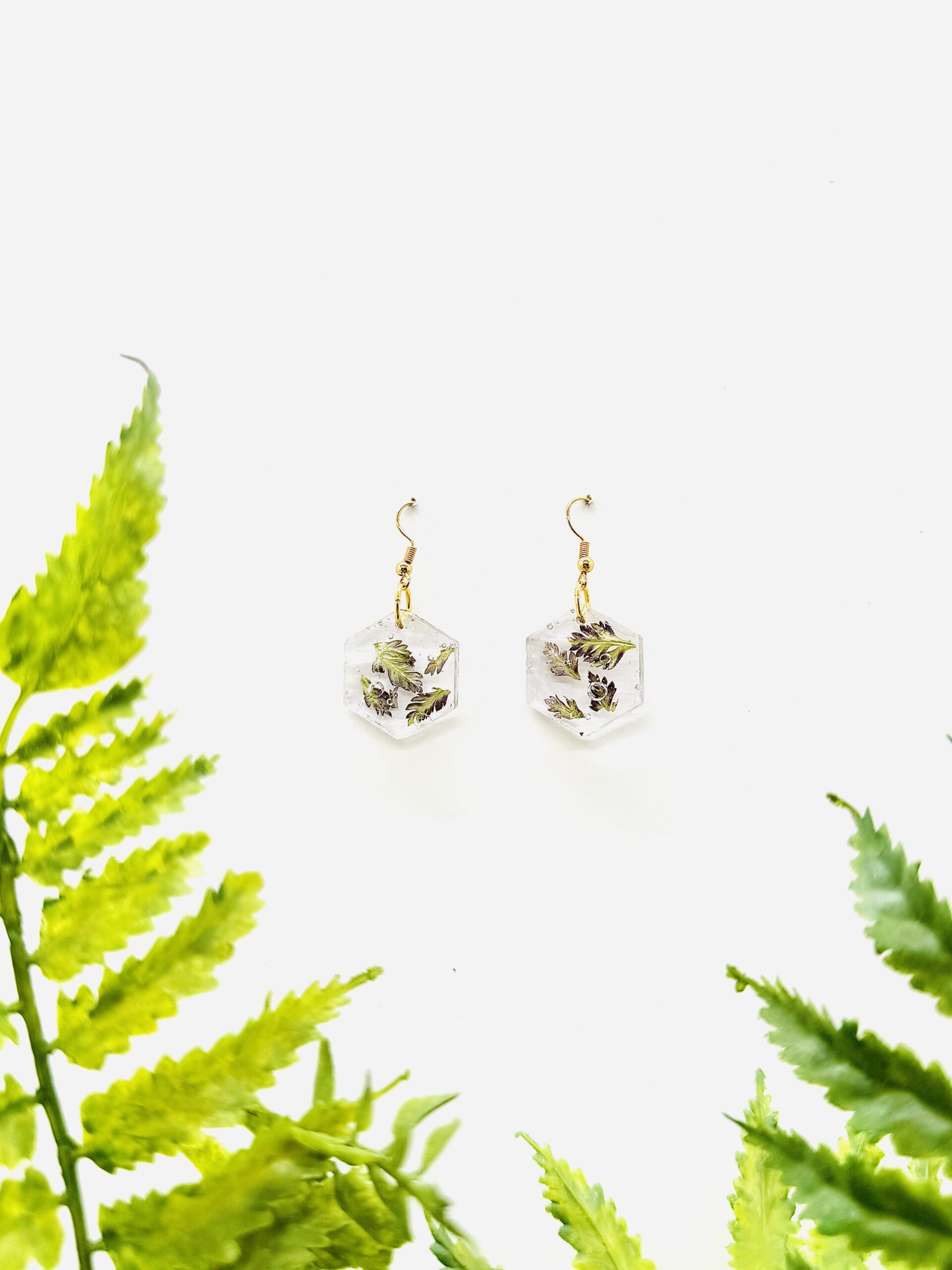 Handmade hexagon shaped earrings made with Queen Anne’s lace leaves inside. Crafted with UV resin and finished with gold-plated hooks, blending nature’s beauty with everyday wearability. Lightweight, durable, and one-of-a-kind — a little piece of nature you can wear.